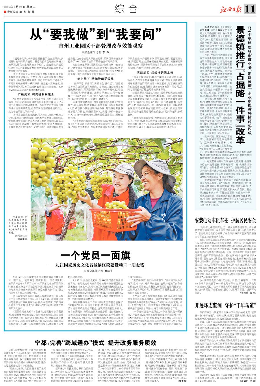 9月15日,九江國家歷史文化名城濱江段建設項目一期工地上,機器奔走,黨旗招展,一派忙碌景象。該項目自去年9月開工以來,長江國家文化公園項目臨時黨支部充分發揮示范引領作用,將黨建工作的凝聚力與影響力轉化為推進項目建設的強大執行力,全力向明年9月竣工的目標沖刺。